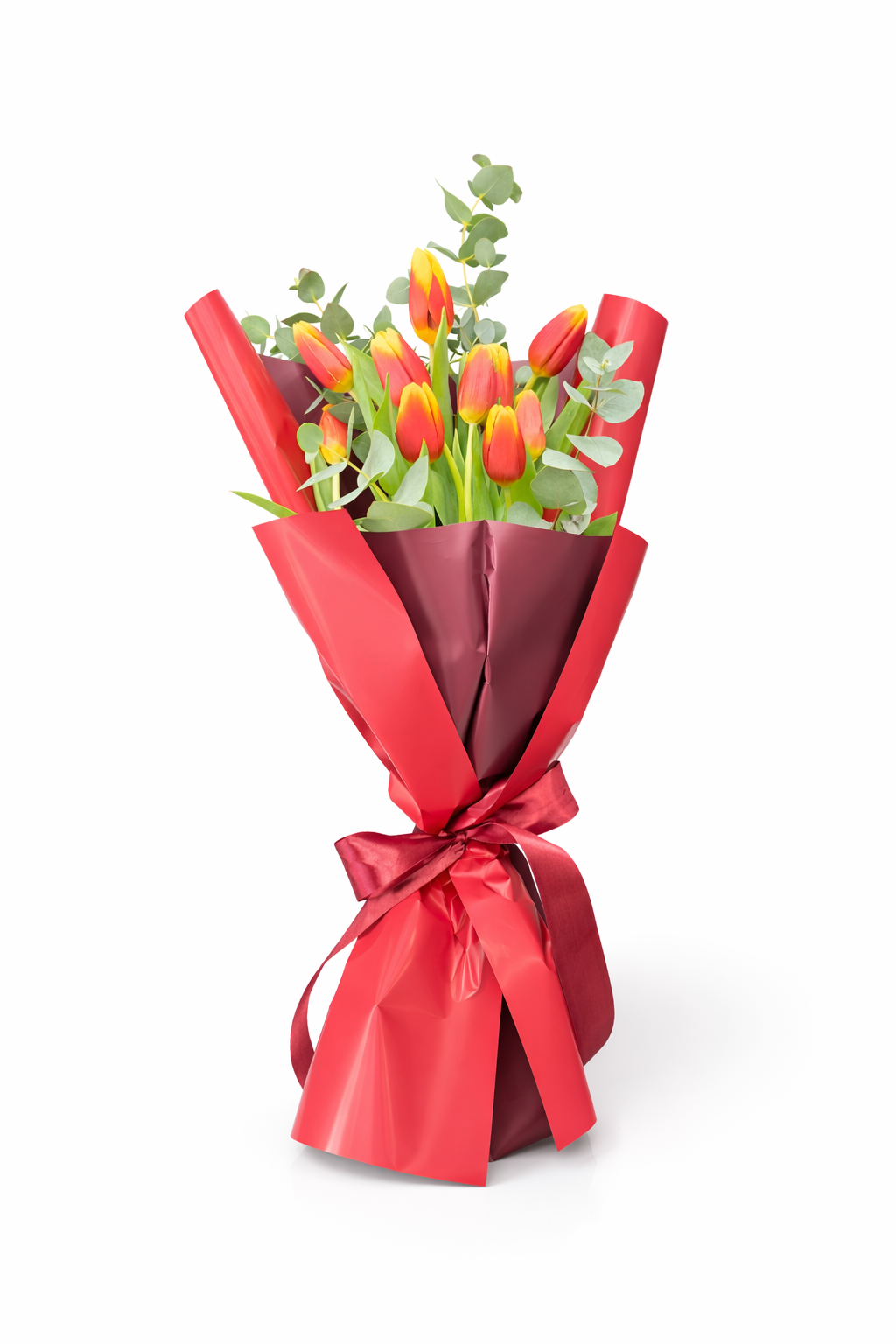 Ένα φωτεινό και χαρούμενο μπουκέτο με εντυπωσιακές τουλίπες σε αποχρώσεις του κόκκινου και του κίτρινου, δεμένες με κομψό περιτύλιγμα και σατέν φιόγκο. Ένα φρέσκο floral arrangement που αποπνέει ζωντάνια, αισιοδοξία και ρομαντισμό.