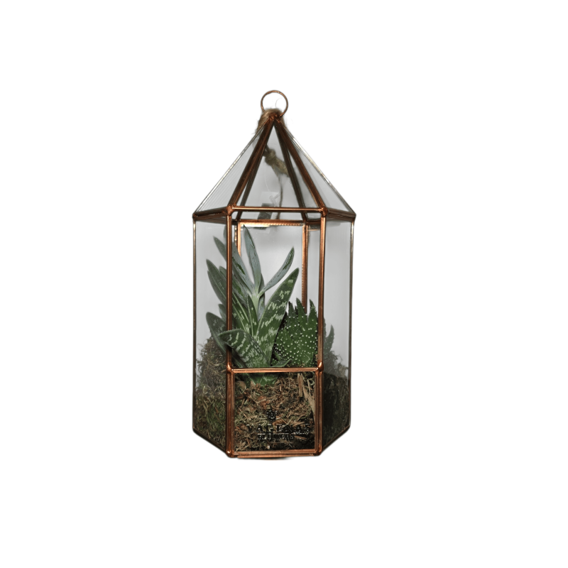 Μια μοντέρνα σύνθεση σε εξαγωνικό γυάλινο terrarium με μεταλλικό πλαίσιο σε χάλκινη απόχρωση. Τα παχύφυτα στο εσωτερικό δημιουργούν ένα μικρό φυσικό σκηνικό που ταιριάζει απόλυτα σε μοντέρνους χώρους, ενώ το design του terrarium δίνει κομψότητα και στυλ.