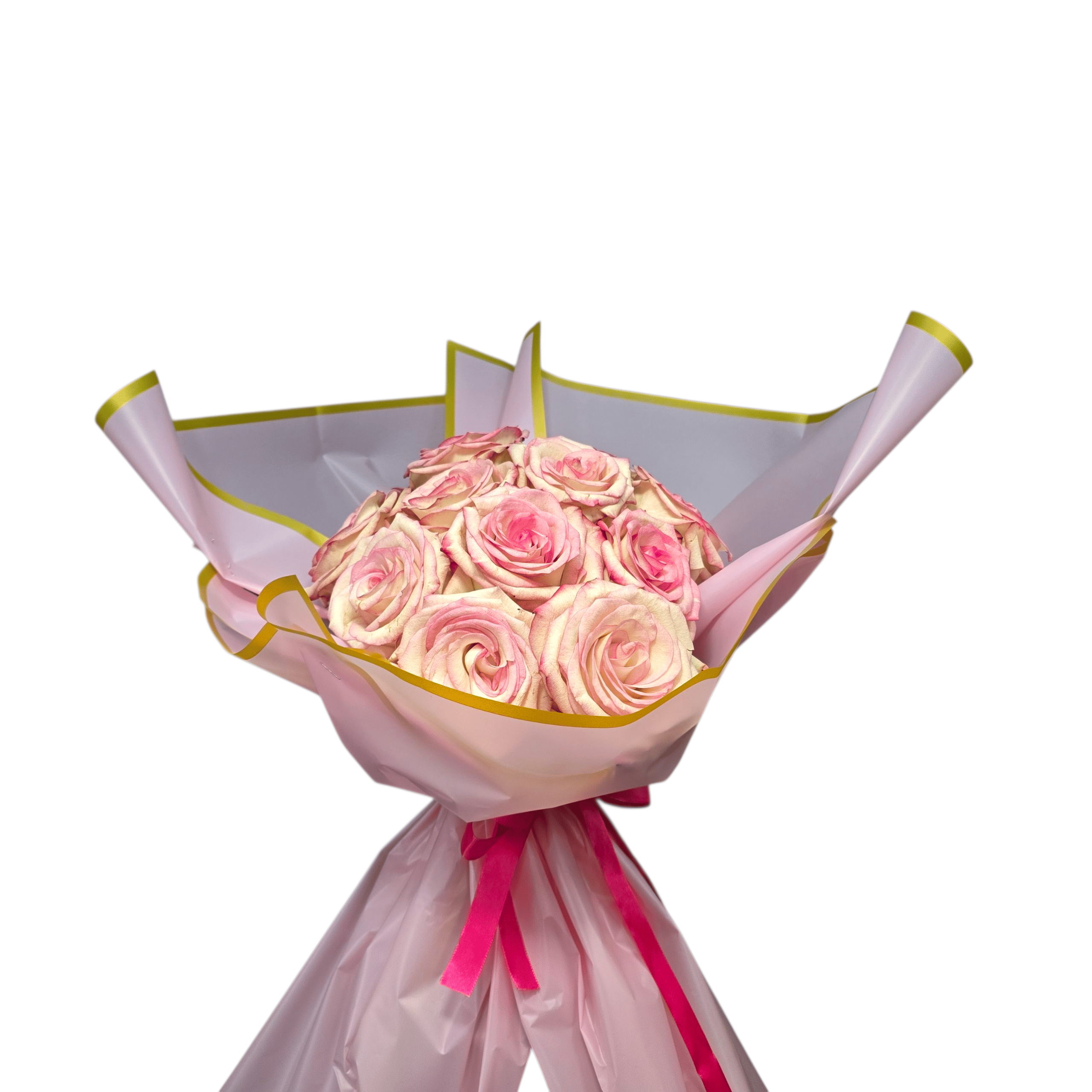 Ρομαντισμός και κομψότητα σε ένα μπουκέτο που ξεχωρίζει με την απλότητα και τη χάρη του. Τα 15 ροζ τριαντάφυλλα, τυλιγμένα σε απαλό ροζ περιτύλιγμα με χρυσές λεπτομέρειες, δημιουργούν μια σύνθεση που αποπνέει τρυφερότητα και γλυκύτητα.
